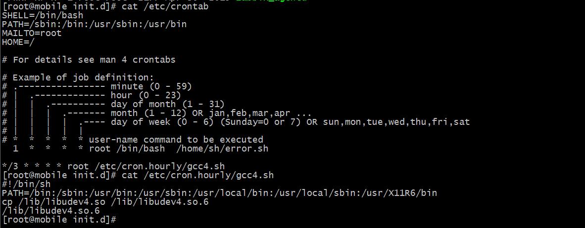 我们看看他到底是什么,”which obgqtvdunq”发现这个命令在/usr/bin下面,多次杀死之后又重新在/usr/bin目录下面生成,想到应该有什么程序在监听这个进程的状态也可能有什么定时任务,发现进程死掉再重新执行,我就按照目前的思路查看了一下/etc/crontab定时任务以及/etc/init.d启动脚本,均发现有问题。 可以看到里面有个定时任务gcc4.sh,这个不是我们设定的,查看一下内容更加奇怪了,这个应该是监听程序死掉后来启动的,我们这边把有关的配置全部删掉,并且删掉/lib/libudev4.so。