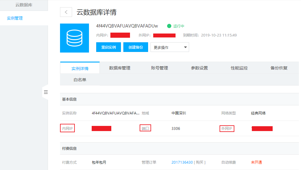 - 在实例详情栏中,即可查看内外网地址及端口信息。