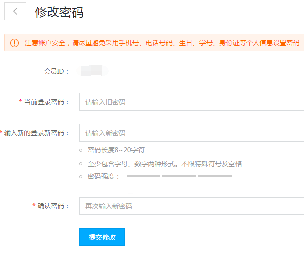 2.输入原密码及新密码,新密码需8-20个字符组成,包含数字、字母及标点符号。